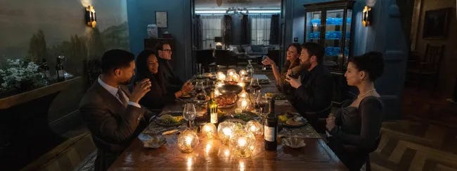 Over the next twelve minutes, Fassbender introduces a game where each dinner guest will select a resolution for the person on their right. The guests don’t know their food is spiked with truth serum, and the resulting game goes completely off the rails in minutes. Resentment, old wounds, and straight nastiness come to the forefront, ending in oddly hilarious and well deserved aggravated assault.